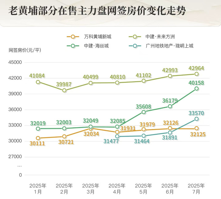 整体上,老黄埔今年因为多个走性价比路线的全新盘入市,以及一些大户型产品降价,板块均价确实有被拉下来一些。但如果具体到一些主力盘上,尤其是卖得比较火的老黄埔“新四大金刚”,它们的价格,基本是不降反增。像7月网签激增的中建·海丝城,价格直接从年初的3.2万/平,涨到4.0万/平。还有广州地铁地产·珑岄上城、中建·未来方洲、万科黄埔新城,今年的房价曲线,也全是抬头向上。
